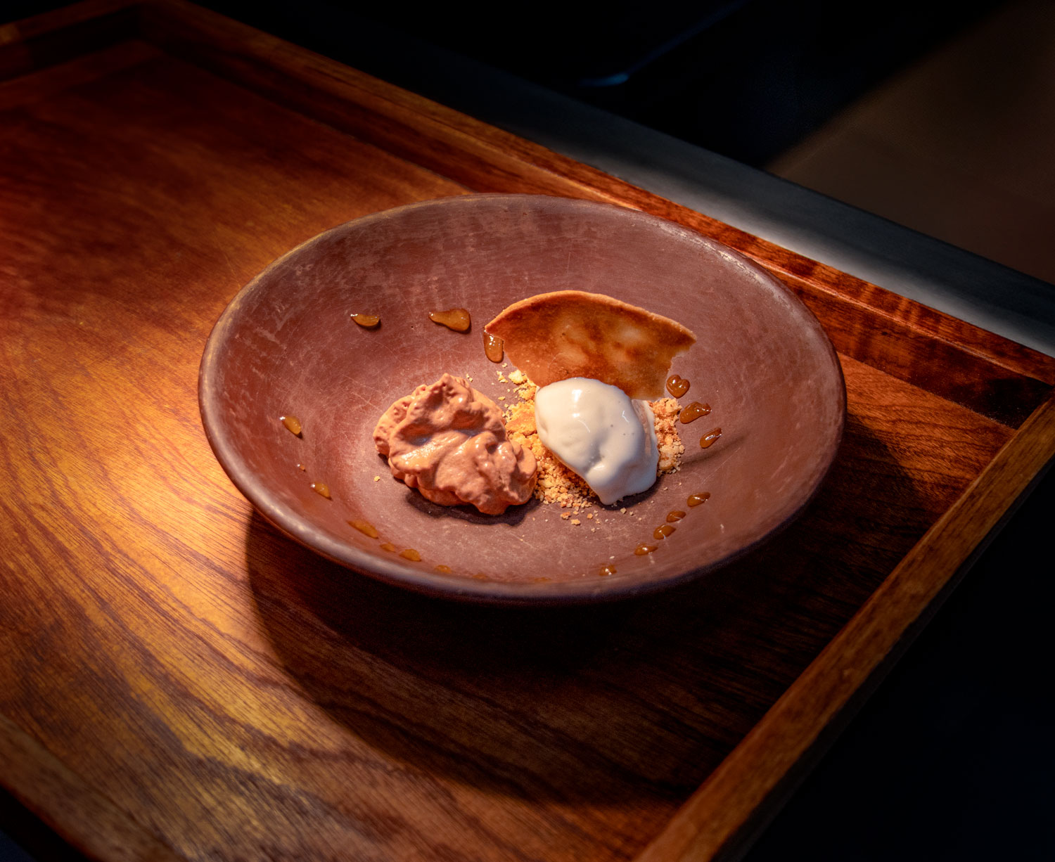 VI · Helado de provolone tabasqueño con duraznos al mezcal y tuile de pibinal