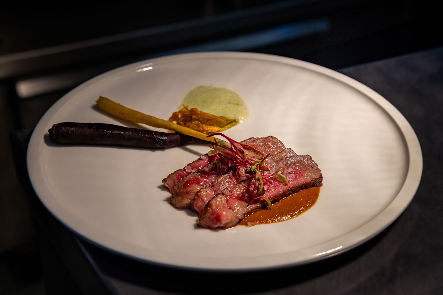 Para esta cena trabajamos de la mano con Noble, empresa especializada en cortes de res de gama alta. Su programa de producción de Wagyu en Uruguay, con genética de clase mundial, ofrece cortes Wagyu Cross con un marmoleo notable, gran jugosidad y una calidad consistente en cada pieza.