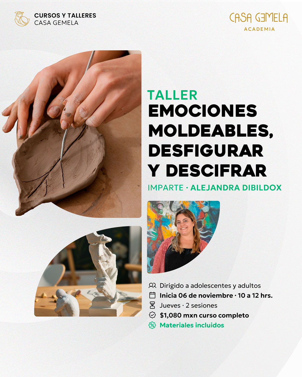 Un espacio para reconectar contigo mismx, procesar emociones y transformar tu experiencia interna en arte a través de la arcilla. Moldea, suelta, observa y resignifica.