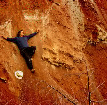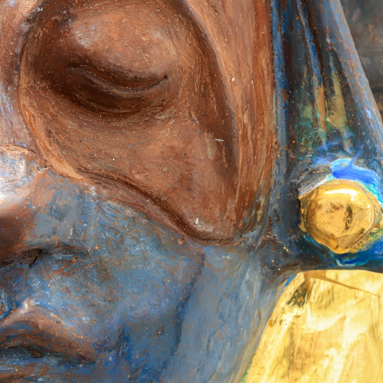 Desarrolla una fascinante técnica con el barro y tierras naturales sobre muros al fresco, y en cerámica hace la alquimia con el fuego, la tierra, el agua y el viento… obteniendo la fijación de los colores que dan vida a su obra, en composiciones casi abstractas.