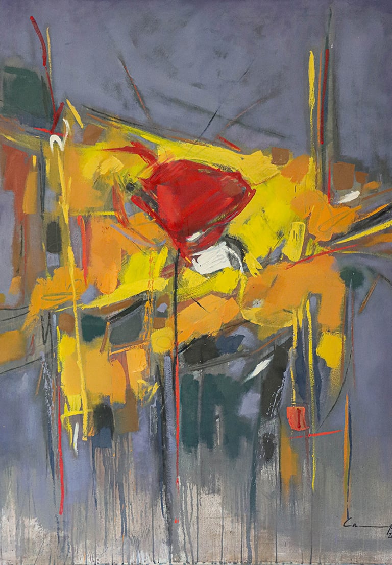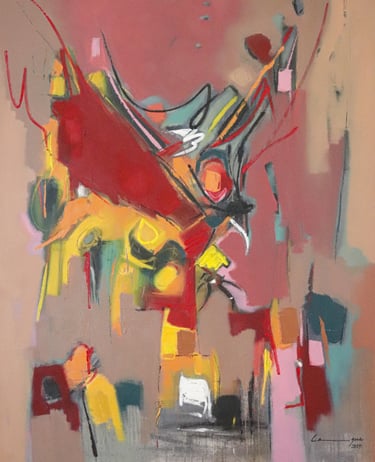 La mitología maya, vasta y enigmática, se erige como un entramado simbólico en el que la existencia se concibe como un perpetuo devenir, un ciclo donde la muerte es génesis y el renacimiento, destino inexorable. En “Renacer”, Roilán Díaz Carrodeguas no solo se adentra en este imaginario ancestral, sino que lo descompone y reconfigura a través de un lenguaje pictórico que oscila entre la abstracción gestual y la evocación simbólica.
